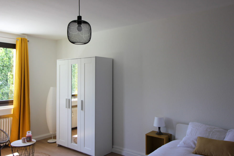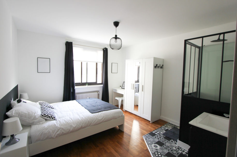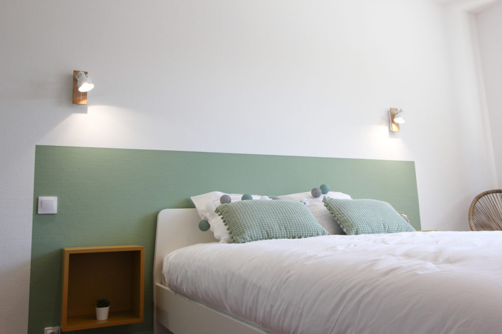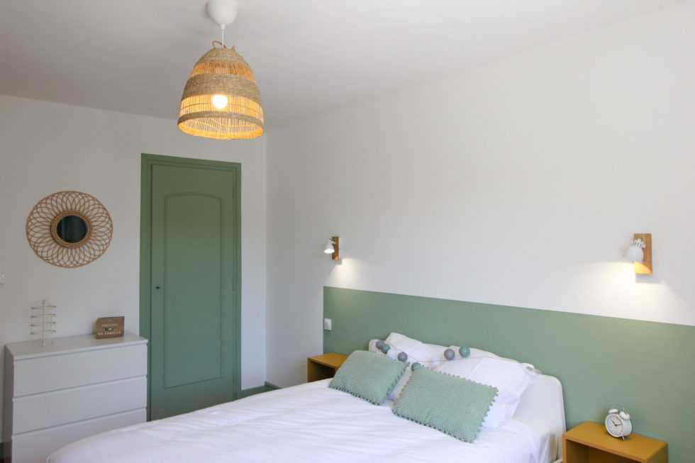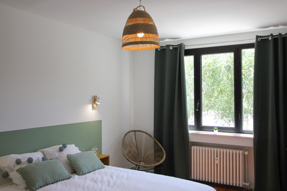 Ambiance naturelle et pastel pour cette chambre de 15m². Salle de bain partagée